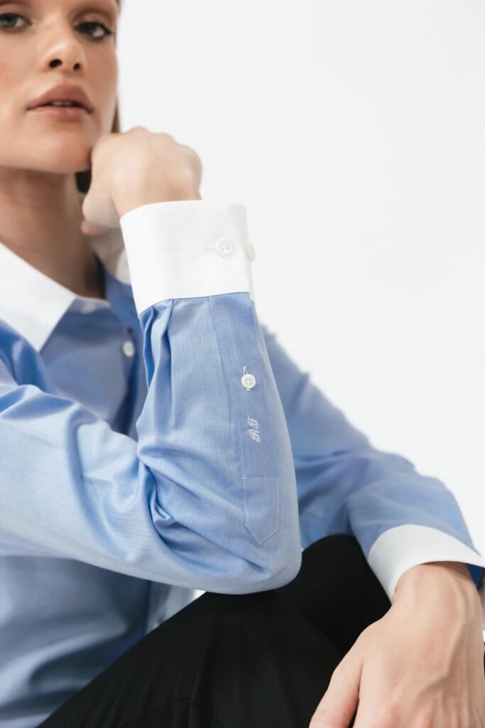 The contrast design delivers a polished professional aesthetic, while Made-to-Measure tailoring allows you to personalise the details and fit. You can choose to contrast both collar and cuffs, or opt for a subtler interpretation by making only one element contrasting. Further customisation options include personalised embroidery on the cuff or sleeve placket, and a choice between a traditional front placket or a cleaner fly-front placket for a more streamlined look.